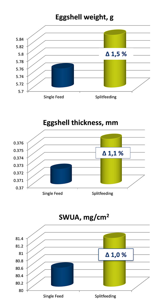 The morning diet is designed to meet requirements during albumen production/deposition, and the ovulation and oviposition occur. The afternoon diet is designed to meet requirements for eggshell formation. As a result of extensive research, new requirements for energy, amino acids, calcium and phosphorous were obtained for the morning and afternoon diets. While the total intake of these nutrients can be reduced, performance was maintained relative to when a single feed is fed (see table 1). In addition, researchers observed a number of additional benefits, including improved eggshell quality (see figure 2).